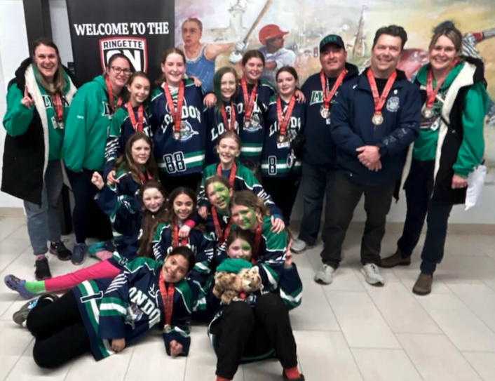 The Ontario Winter Games, showcased the best ringette in the Province and featured no less than 12 London Lynx athletes. It was a weekend of thrilling ringette that eventually saw the Blue Team crowned Gold, Team Red would win Silver, and Team Black took home Bronze. Congratulations to all these amazing high performance athletes! Photo (left to right): Charlotte Sheppard, Greer Boughner, Lainey West, Coach Mel Evans, Olive Aarts, Avalyn Meriam, Eve Jackson, and Ella Brodhagen. London Lynx players winning Bronze included Natalie Parsons and Zoe Maddox!